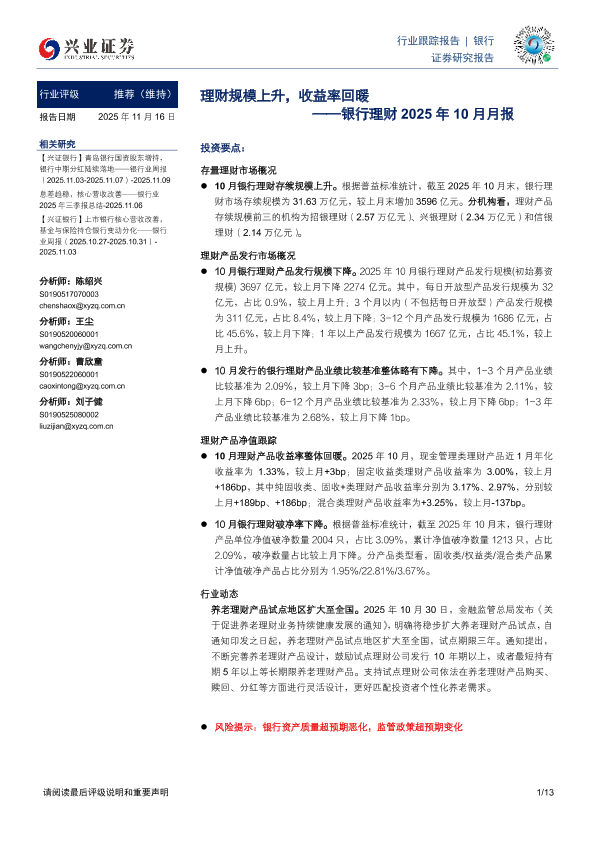 【兴业证券】【202511】银行理财2025年10月月报:理财规模上升,收益率回暖-13页