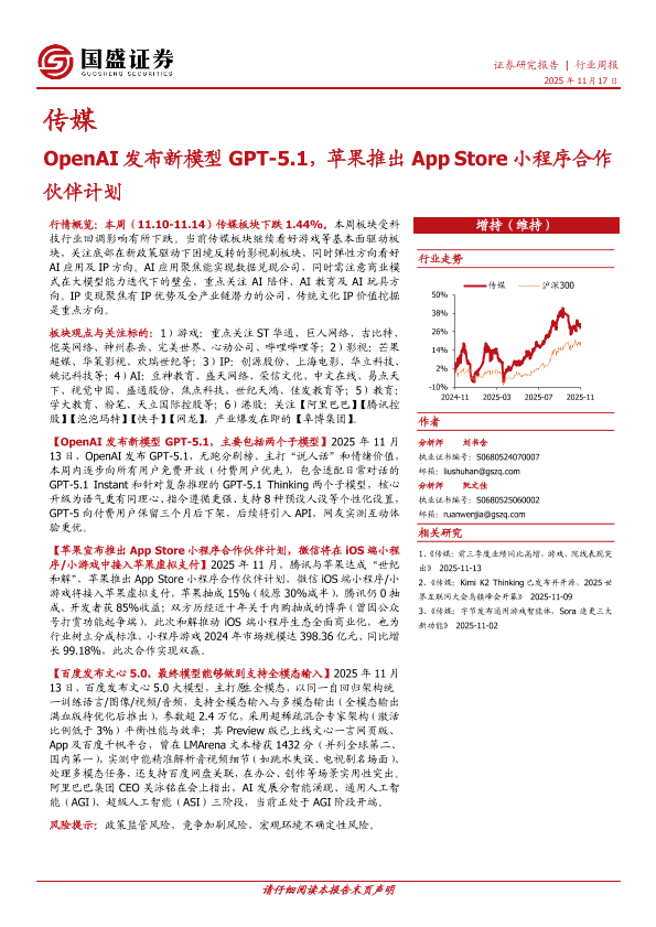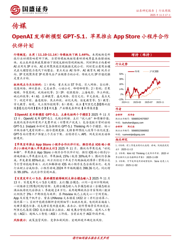【国盛证券】【202511】20251117-国盛证券-传媒行业周报:OpenAI发布新模型GPT-5.1,苹果推出App Store小程序合作伙伴计划.pdf-10页