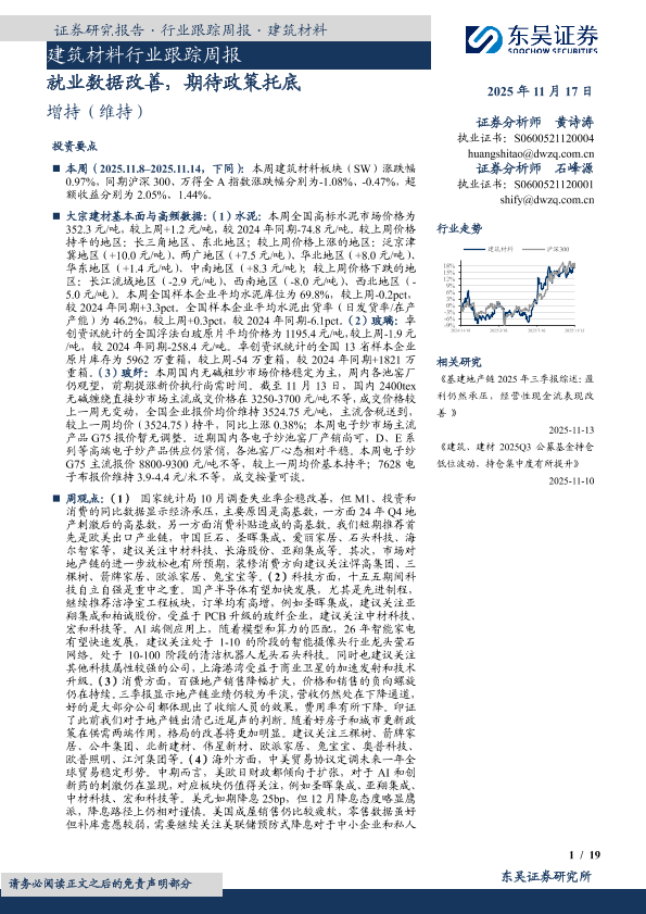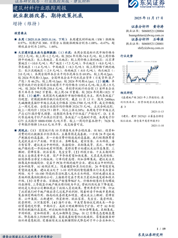 【东吴证券】【202511】建筑材料行业跟踪周报:就业数据改善,期待政策托底-19页