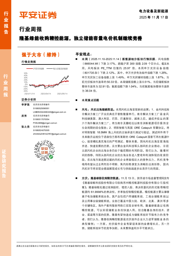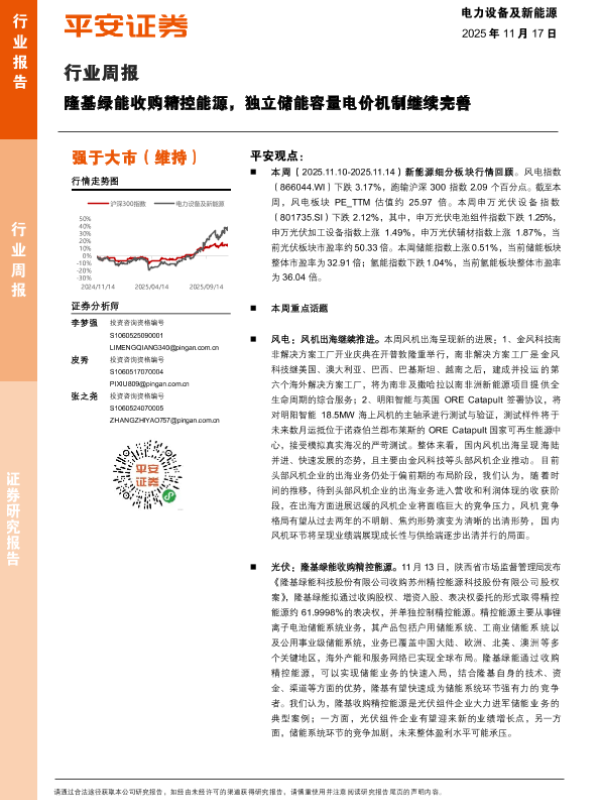 【平安证券】【202511】电力设备及新能源行业周报:隆基绿能收购精控能源,独立储能容量电价机制继续完善-18页
