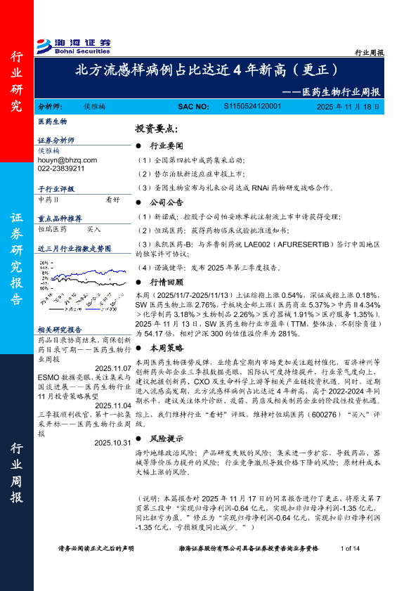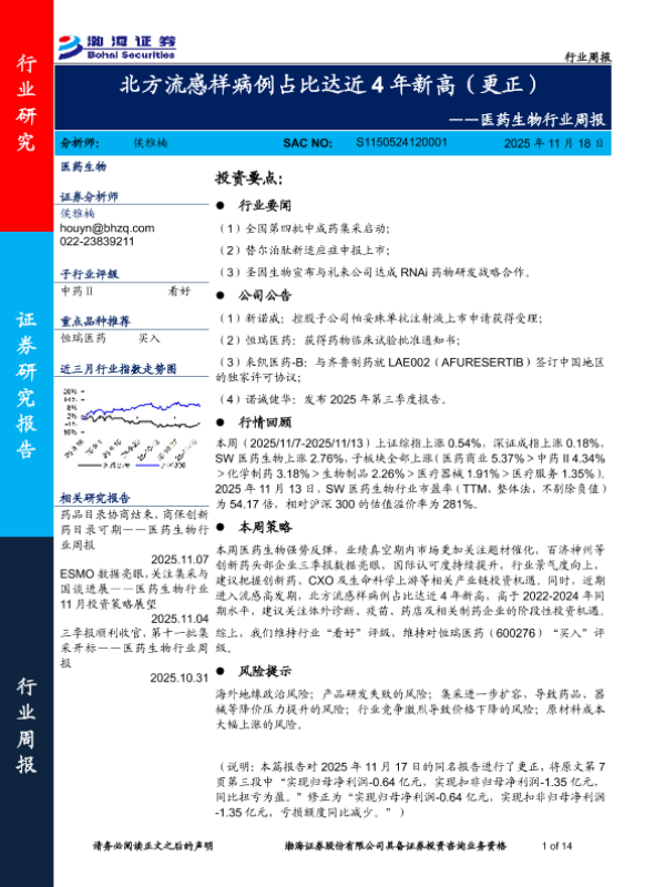 【渤海证券】【202511】医药生物行业周报——北方流感样病例占比达近4年新高(更正)-14页