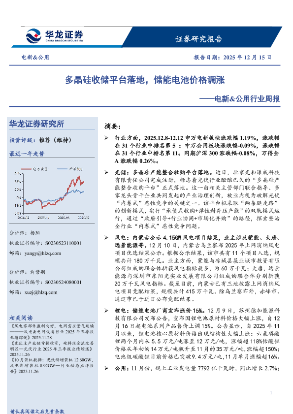 【华龙证券】【202512】多晶硅收储平台落地,储能电池价格调涨——电新&公用行业周报-15页