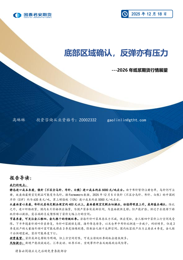 【国泰君安期货】【202512】2026年纸浆期货行情展望-底部区域确认,反弹亦有压力-21页