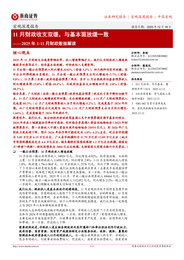 【浙商证券】【202512】11月财政收支双缓,与基本面放缓一致——2025年 1-11月财政数据解读-11页