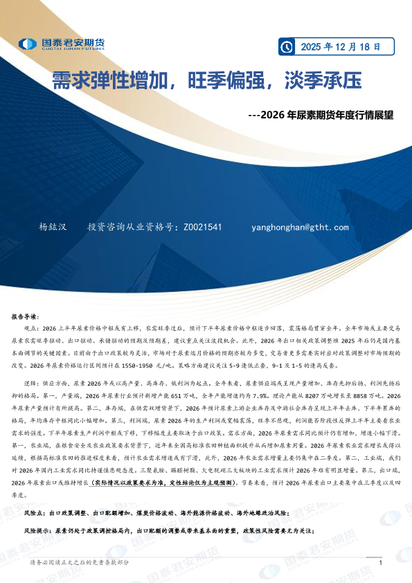 【国泰君安期货】【202512】2026年尿素期货年度行情展望_需求弹性增加_旺季偏强_淡季承压-22页