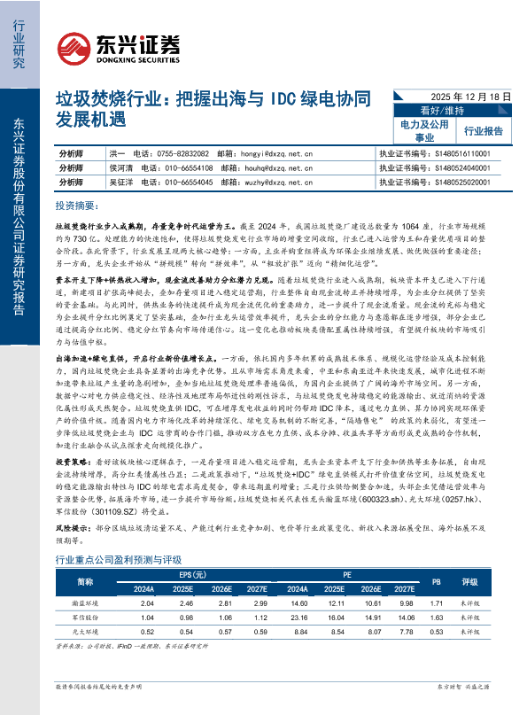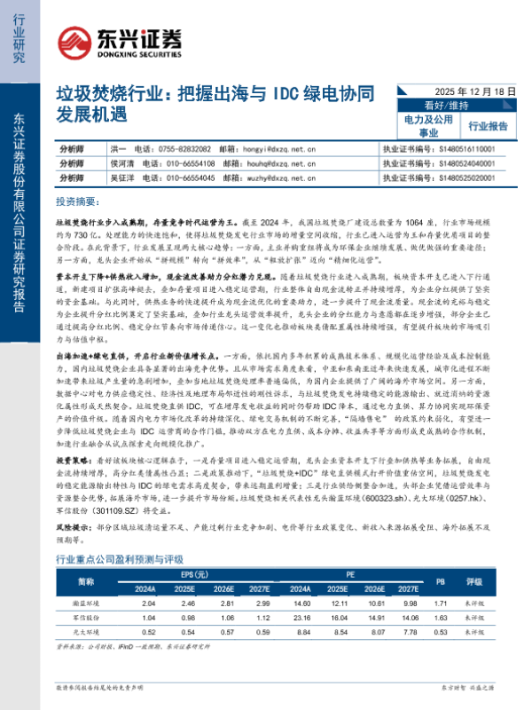 【东兴证券】【202512】垃圾焚烧行业:把握出海与 IDC绿电协同发展机遇-13页