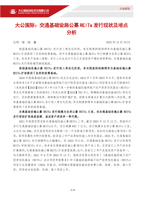 【大公国际】【202512】交通基础设施公募 REITs发行现状及堵点分析-3页