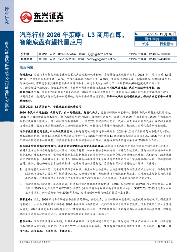 【东兴证券】【202512】汽车行业 2026年策略:L3商用在即,智能底盘有望批量应用-25页