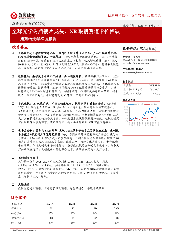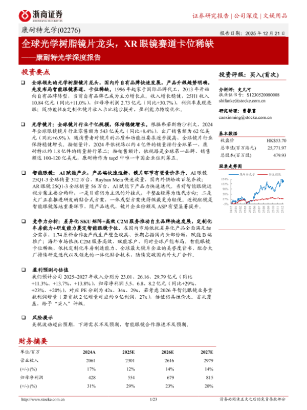 【浙商证券】【202512】全球光学树脂镜片龙头,XR眼镜赛道卡位稀缺——康耐特光学深度报告-23页
