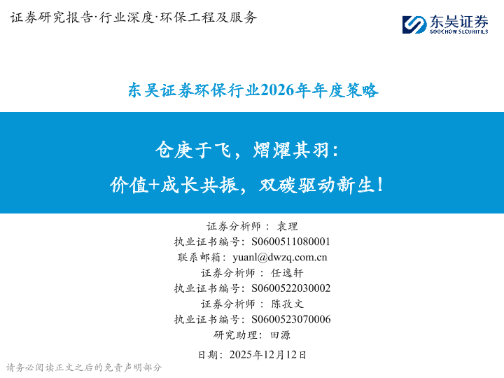【东吴证券】【202512】环保行业2026年年度策略:仓庚于飞,熠燿其羽:价值+成长共振,双碳驱动新生!-104页