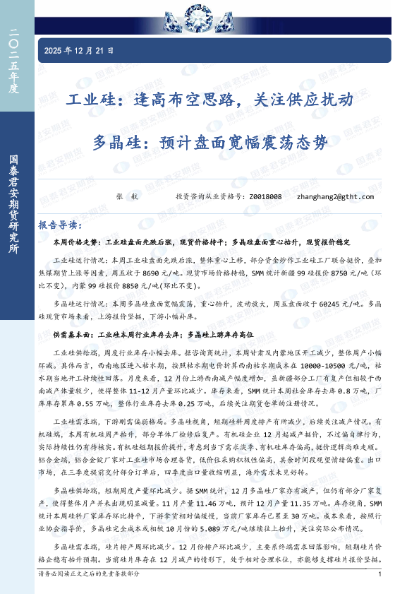 【国泰君安期货】【202512】工业硅:逢高布空思路,关注供应扰动 多晶硅:预计盘面宽幅震荡态势-10页