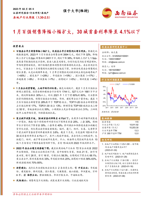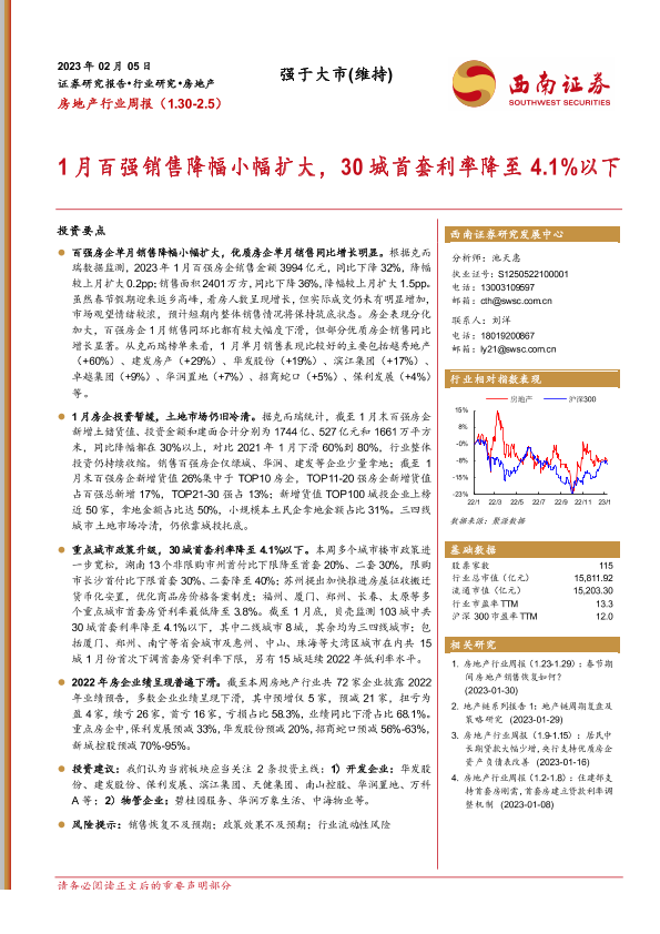 【西南证券】【20230205】房地产行业周报:1月百强销售降幅小幅扩大,30城首套利率降至4.1%以下-14页