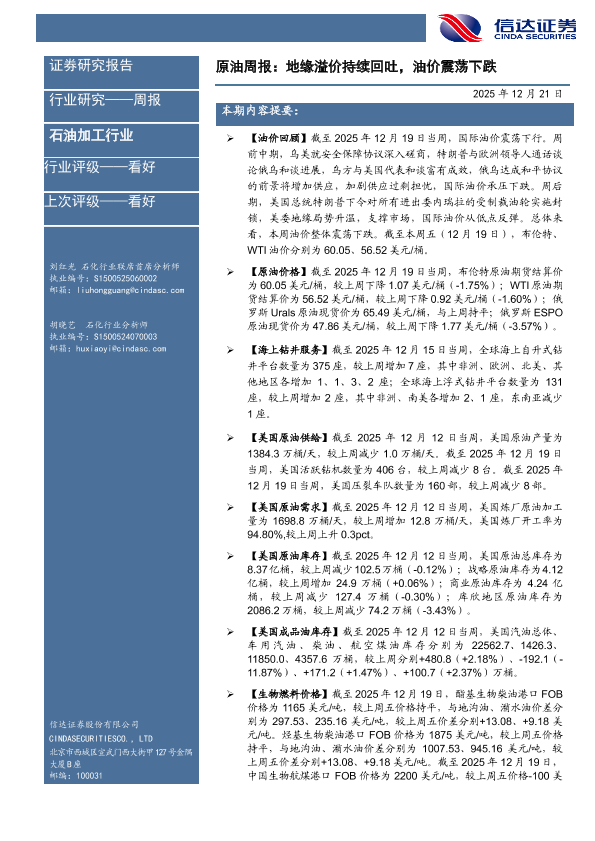 【信达证券】【202512】原油周报:地缘溢价持续回吐,油价震荡下跌-29页