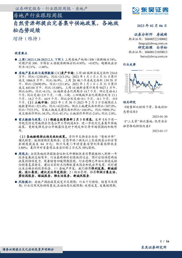 【东吴证券】【20230206】房地产行业跟踪周报:自然资源部提出完善集中供地政策,各地放松态势延续-16页