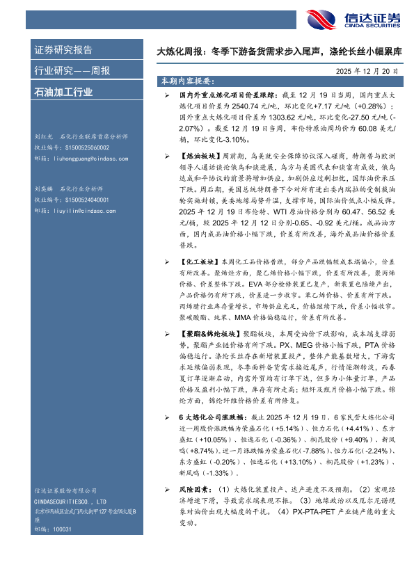 【信达证券股份有限公司 C INDASECUR IT IESCO.,LTD】【202512】大炼化周报:冬季下游备货需求步入尾声,涤纶长丝小幅累库-25页