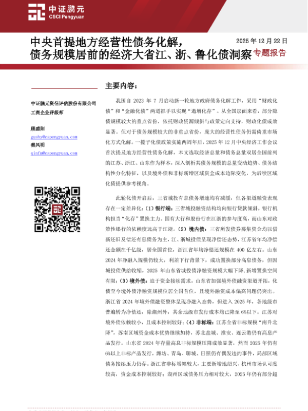 【中证鹏元资信评估股份有限公司】【202512】债务规模居前的经济大省江、浙、鲁化债洞察-15页