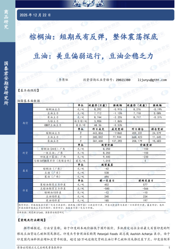 【国泰君安期货】【202512】棕榈油:短期或有反弹,整体震荡探底;豆油:美豆偏弱运行,豆油企稳乏力-3页