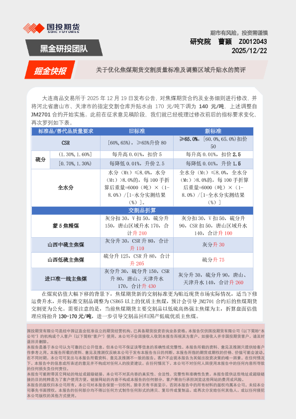 【黑金研投团队&国投期货有限公司】【202512】关于优化焦煤期货交割质量标准及调整区域升贴水的简评-1页