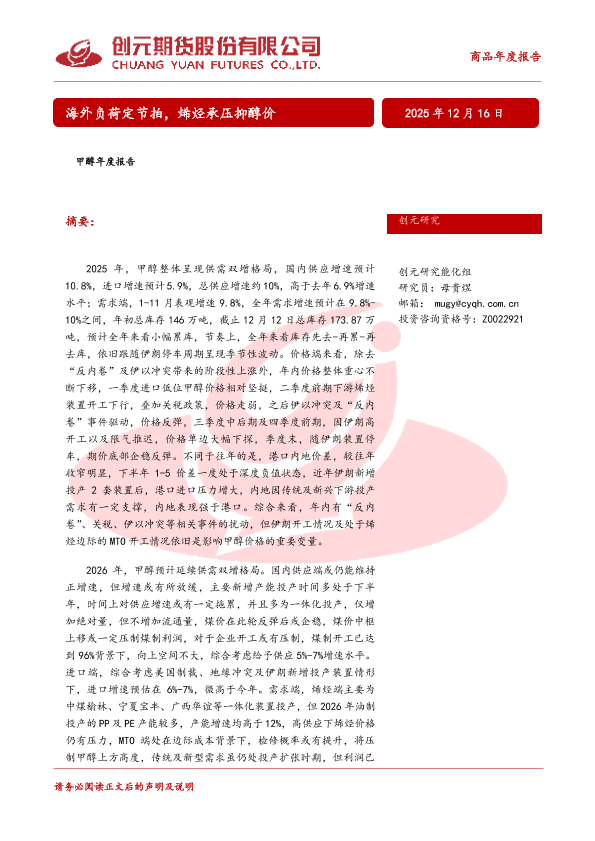 【创元研究】【202512】甲醇年度报告-27页