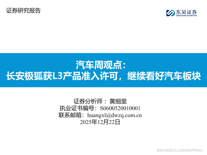 【东吴证券】【202512】汽车周观点: 长安极狐获L3产品准入许可,继续看好汽车板块-25页