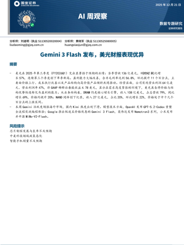 【国金证券】【202512】AI周观察:Gemini 3 Flash发布,美光财报表现优异-7页
