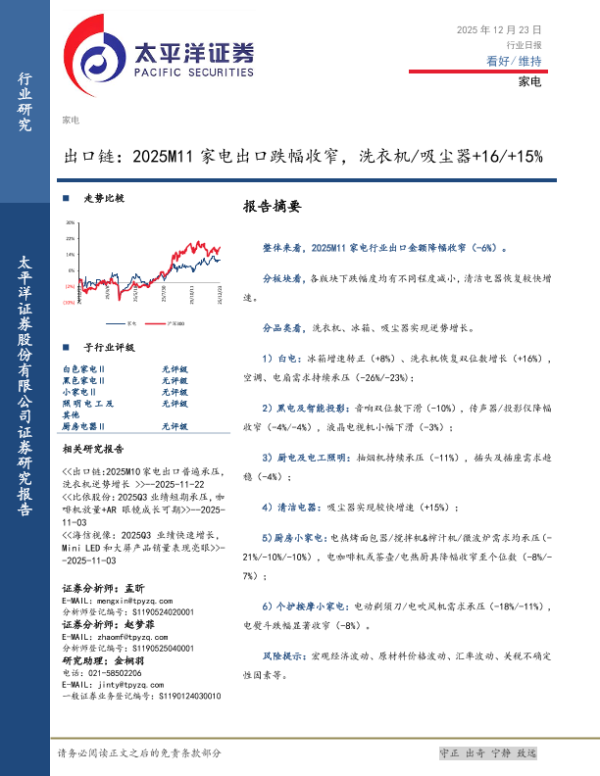 【太平洋证券】【202512】出口链:2025M11家电出口跌幅收窄,洗衣机/吸尘器+16/+15%-4页