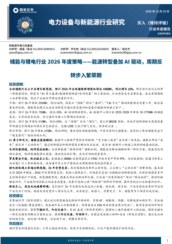 【国金证券】【202512】储能与锂电行业2026年度策略:能源转型叠加AI驱动,周期反转步入繁荣期-49页