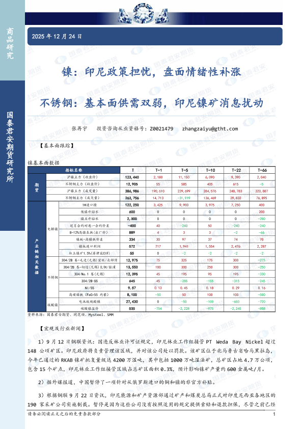 【国泰君安期货】【202412】镍:印尼政策担忧,盘面情绪性补涨 不锈钢:基本面供需双弱,印尼镍矿消息扰动-3页