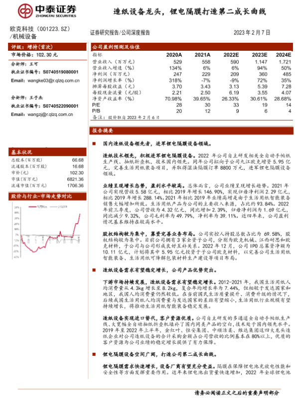 市场预测 欧克科技 财务分析 造纸设备 锂电隔膜