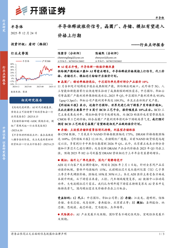 【开源证券】【202512】半导体释放涨价信号,晶圆厂、存储、模拟有望进入价格上行期-3页