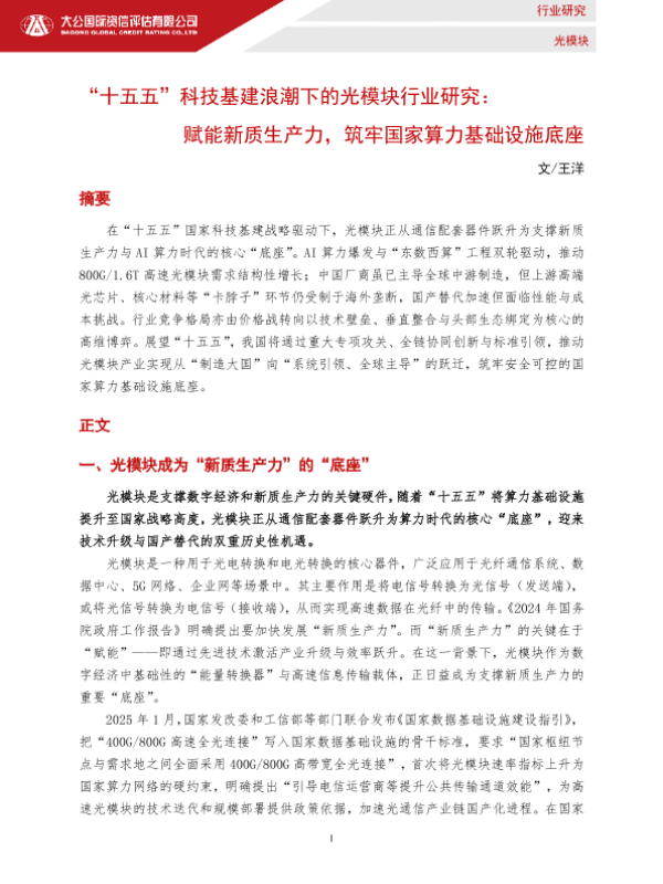 【大公国际】【202512】“十五五”科技基建浪潮下的光模块行业研究:赋能新质生产力,筑牢国家算力基础设施底座-6页