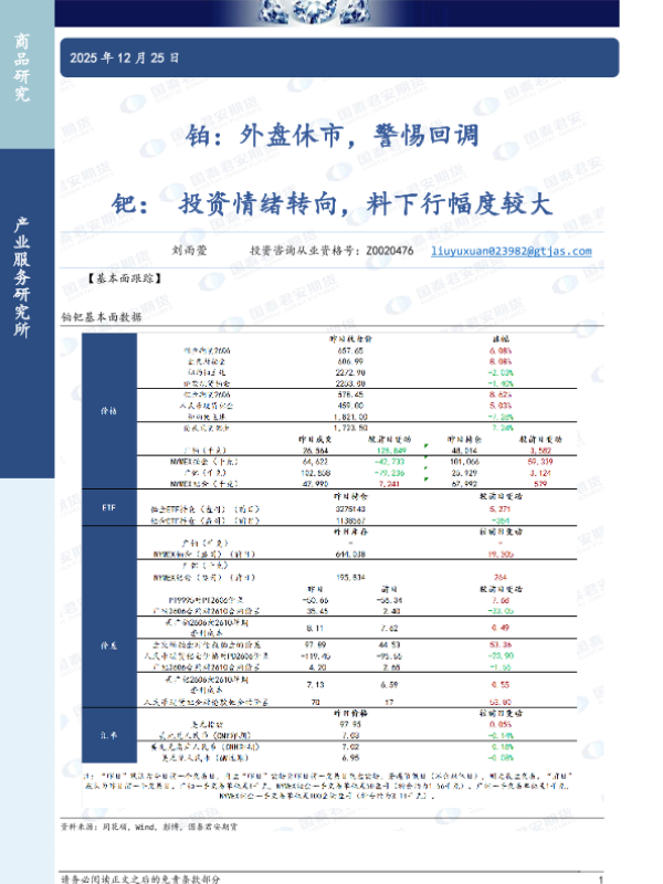 【国泰君安期货】【202512】铂:外盘休市,警惕回调;钯:投资情绪转向,料下行幅度较大-3页