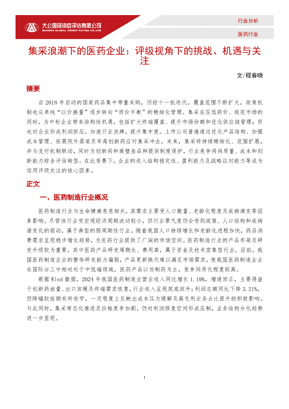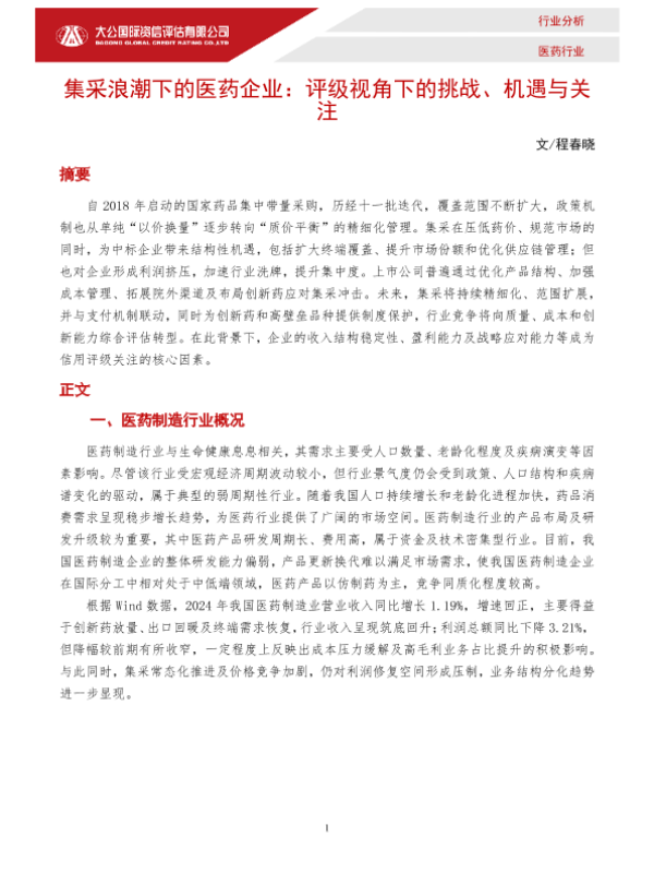 【大公国际】【2024】集采浪潮下的医药企业:评级视角下的挑战、机遇与关注-6页