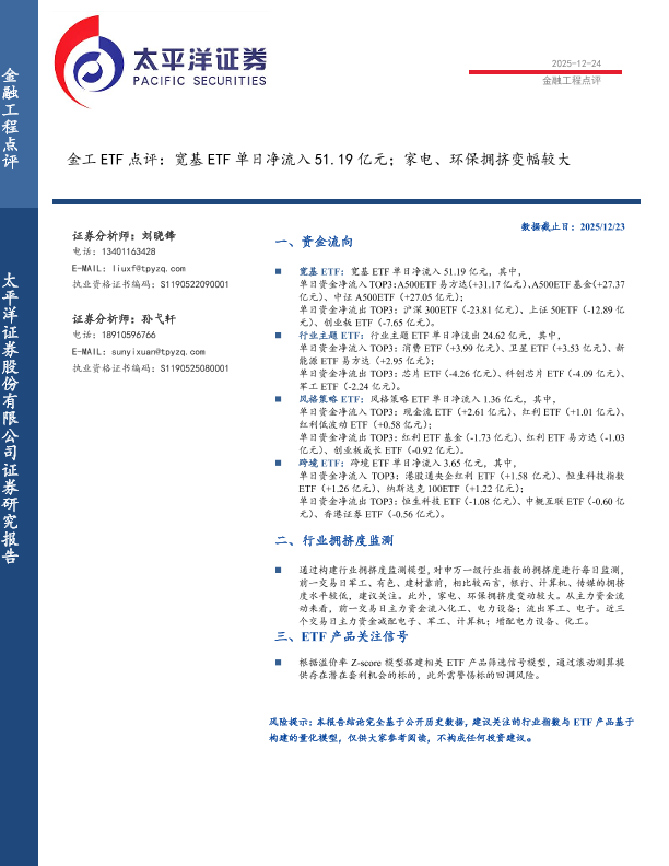 【太平洋证券】【202512】金工 ETF点评:宽基 ETF单日净流入 51.19亿元;家电、环保拥挤变幅较大-6页