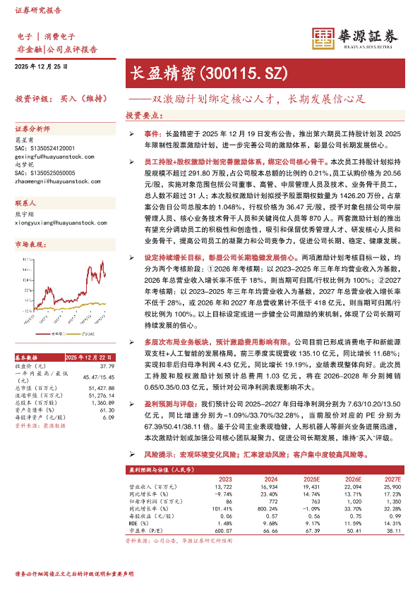 长盈精密 人形机器人 股权激励 员工持股 盈利预测