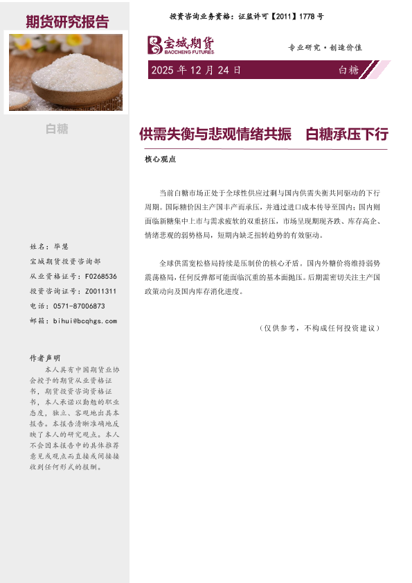 【宝城期货投资咨询部】【202512】供需失衡与悲观情绪共振 白糖承压下行-12页