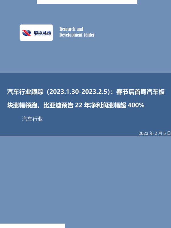 【信达证券】【20230205】汽车行业跟踪(2023.1.30-2023.2.5):春节后首周汽车板块涨幅领跑,比亚迪预告22年净利润涨幅超400%-27页