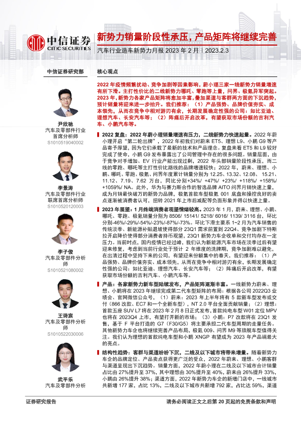 【中信证券】【20230203】汽车行业造车新势力月报2023年2月:新势力销量阶段性承压,产品矩阵将继续完善-21页
