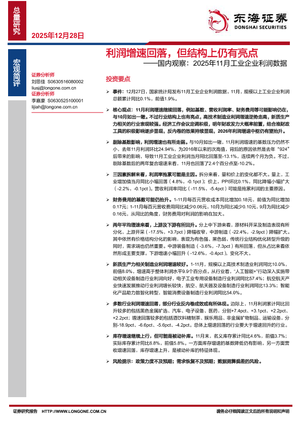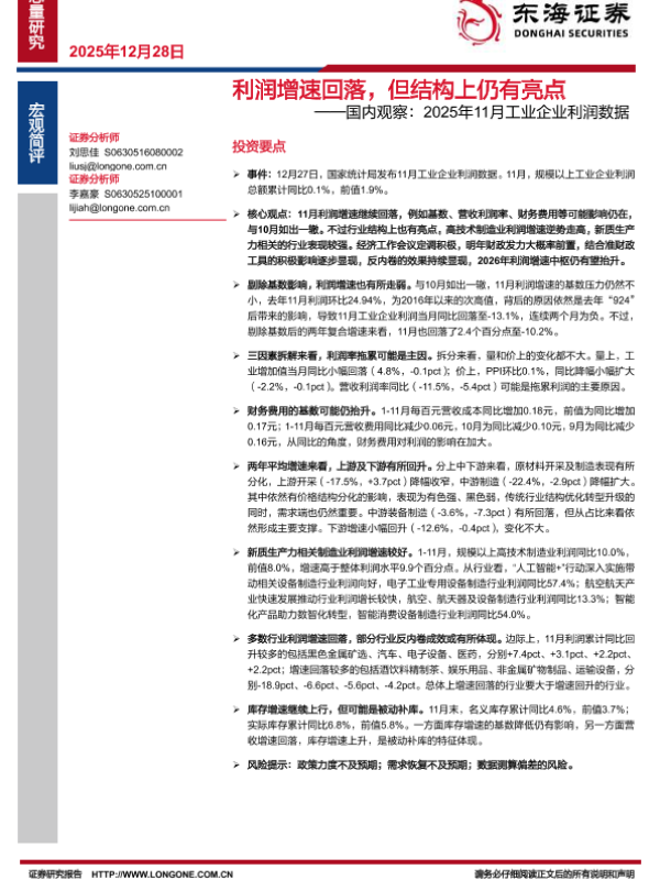 【东海证券】【202512】利润增速回落,但结构上仍有亮点——国内观察:2025年11月工业企业利润数据-4页