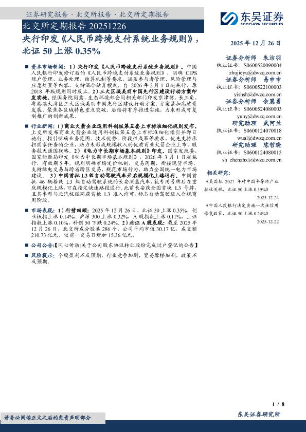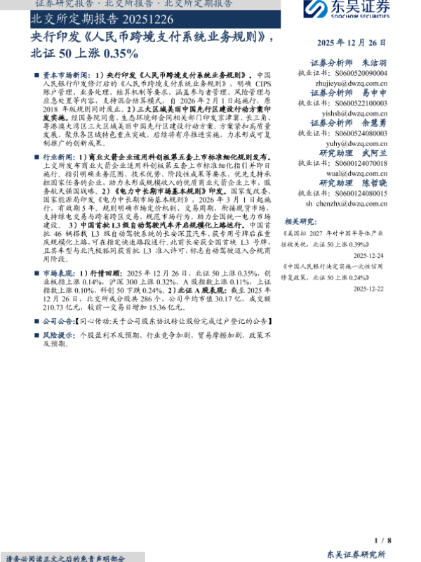 【东吴证券】【202512】央行印发《人民币跨境支付系统业务规则》,北证50上涨0.35%-8页