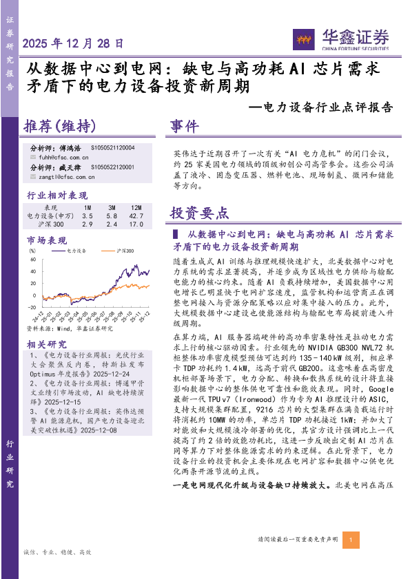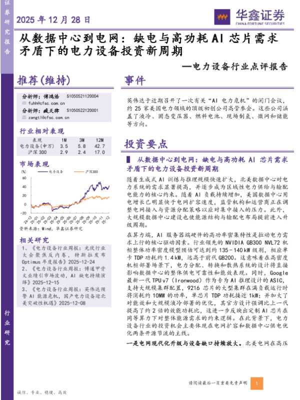 【华鑫证券】【202512】从数据中心到电网:缺电与高功耗AI芯片需求矛盾下的电力设备投资新周期-5页