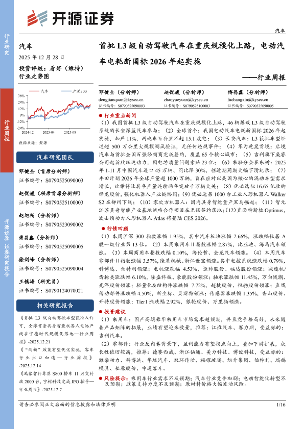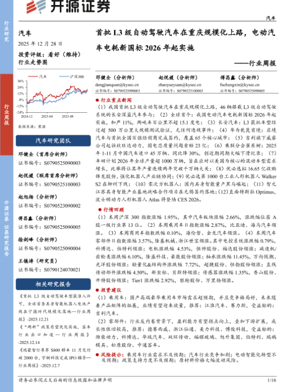 【开源证券】【202512】汽车行业周报:首批L3级自动驾驶汽车在重庆规模化上路,电动汽车电耗新国标2026年起实施-16页