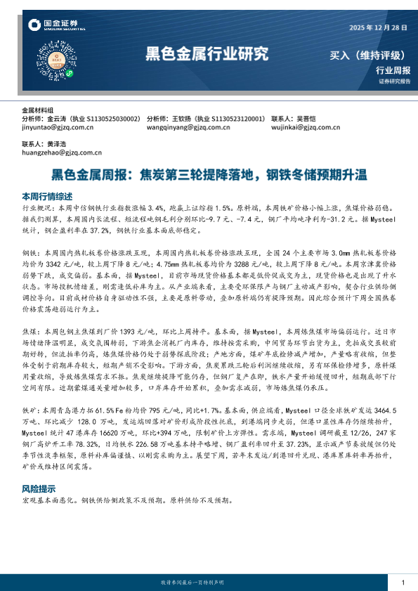 【国金证券】【202312】黑色金属周报:焦炭第三轮提降落地,钢铁冬储预期升温-14页