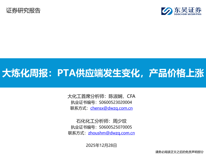 【东吴证券】【202512】大炼化周报:PTA供应端发生变化,产品价格上涨-34页