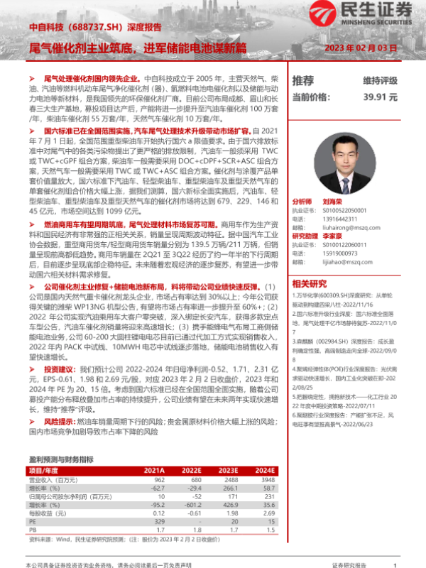 【民生证券】【20230203】深度报告:尾气催化剂主业筑底,进军储能电池谋新篇-24页