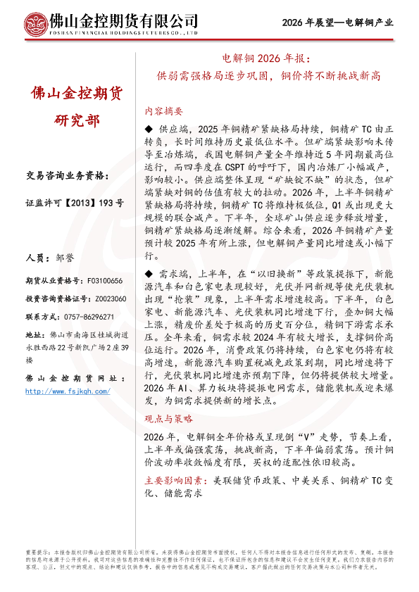 【佛山金控期货有限公司】【2025】电解铜 2026年报:供弱需强格局逐步巩固,铜价将不断挑战新高-29页