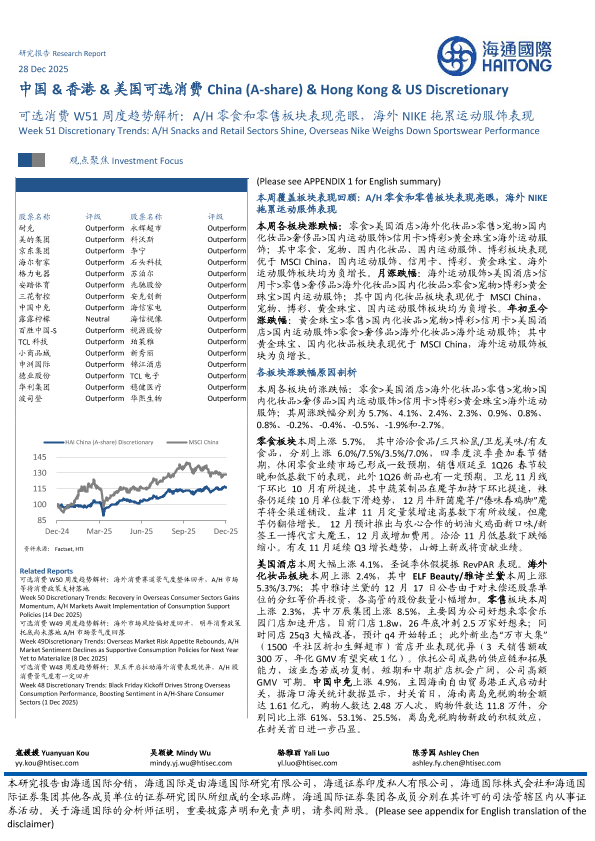 【海通国际】【202512】中国&香港&美国可选消费 W51周度趋势解析:A/H零食和零售板块表现亮眼,海外 NIKE拖累运动服饰表现-15页