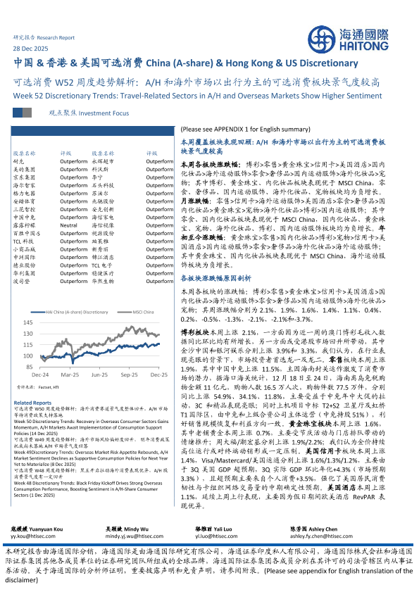 【海通国际】【202512】中国&香港&美国可选消费 China(A-share)& Hong Kong& US Discretionary 可选消费 W52周度趋势解析:A/H和海外市场以出行为主的可选消费板块景气度较高-15页