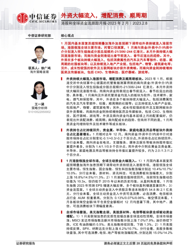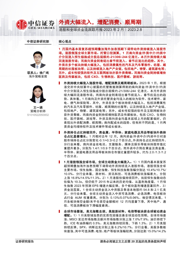 【中信证券】【20230208】港股和全球资金流跟踪月报_2023年2月:外资大幅流入,增配消费、顺周期-21页