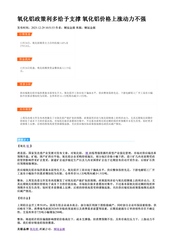 【铜冠金源期货】【202512】氧化铝政策利多给予支撑 氧化铝价格上涨动力不强-2页